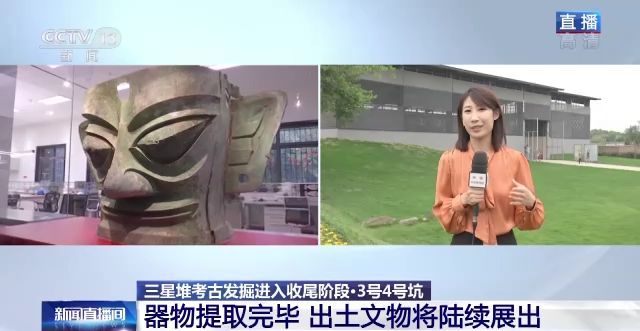 總臺央視記者 任梅梅:3號坑和4號坑發(fā)掘進度最快,文物已經(jīng)全部提取,目前是處于“封坑”的狀態(tài)。3號坑曾經(jīng)出土了不少“明星文物”,比如在春晚亮相的青銅大面具,這也是目前三星堆出土的體量最大、相對最完整的青銅大面具。