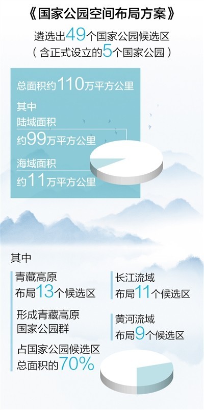 在空間布局上,遴選出49個國家公園候選區(qū)(含正式設立的5個國家公園),總面積約110萬平方公里,其中陸域面積約99萬平方公里、海域面積約11萬平方公里,占陸域國土面積的10.3%。充分銜接國家重大戰(zhàn)略和重大生態(tài)工程,其中,青藏高原布局13個候選區(qū),形成青藏高原國家公園群,占國家公園候選區(qū)總面積的70%;長江流域布局11個候選區(qū),黃河流域布局9個候選區(qū)。全部建成后,中國國家公園保護面積的總規(guī)模將居世界第一。