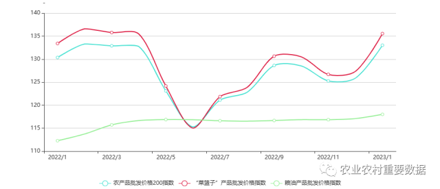 央視網消息:據(jù)農業(yè)農村重要數(shù)據(jù)公眾號消息,2023年1月,全國農產品批發(fā)價格200指數(shù)為133.04,環(huán)比上漲7.16個點, 同比上漲2.66個點;菜籃子產品指數(shù)為135.57,環(huán)比上漲8.22個點,同比上漲2.15個點;糧油產品指數(shù)為118.01,環(huán)比上漲0.92個點,同比上漲5.73個點。