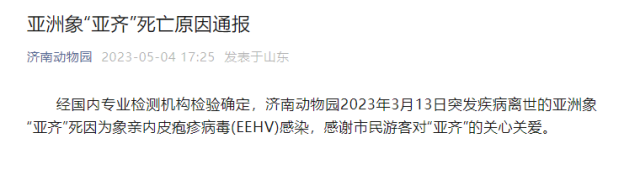 央視網(wǎng)消息:5月4日,濟(jì)南動(dòng)物園公眾號(hào)通報(bào)亞洲象“亞齊”死亡原因。 經(jīng)國(guó)內(nèi)專業(yè)檢測(cè)機(jī)構(gòu)檢驗(yàn)確定,濟(jì)南動(dòng)物園2023年3月13日突發(fā)疾病離世的亞洲象“亞齊”死因?yàn)橄笥H內(nèi)皮皰疹病毒(EEHV)感染,感謝市民游客對(duì)“亞齊”的關(guān)心關(guān)愛。