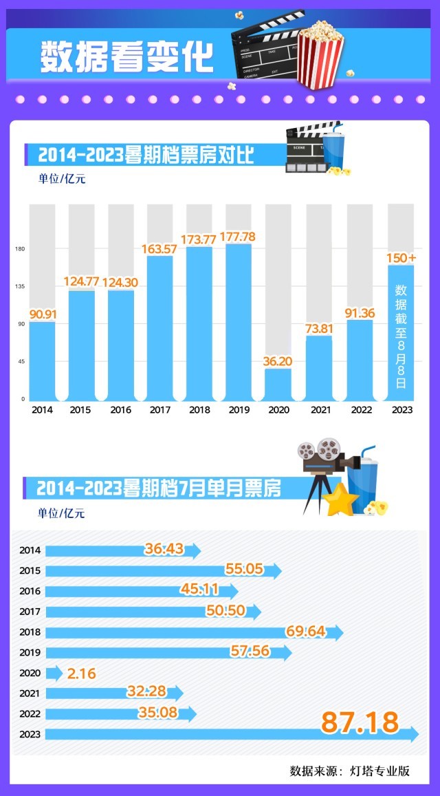 據燈塔專業(yè)版數據,2023年,僅7月中國電影總票房就達到87.18億,總人次2.12億,總場次1183.3萬,創(chuàng)造中國影史7月票房新紀錄。