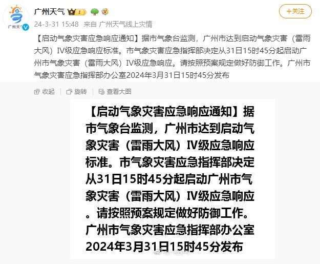 央視網(wǎng)消息:據(jù)廣州天氣 消息,據(jù)廣州市氣象臺監(jiān)測,廣州市達(dá)到啟動氣象災(zāi)害(雷雨大風(fēng))Ⅳ級應(yīng)急響應(yīng)標(biāo)準(zhǔn)。市氣象災(zāi)害應(yīng)急指揮部決定從31日15時45分起啟動廣州市氣象災(zāi)害(雷雨大風(fēng))Ⅳ級應(yīng)急響應(yīng)。請按照預(yù)案規(guī)定做好防御工作。