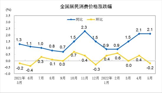 據(jù)國家統(tǒng)計(jì)局城市司高級統(tǒng)計(jì)師董莉娟介紹,從同比看,5月份CPI上漲2.1%,漲幅與上月相同。其中,食品價(jià)格上漲2.3%,漲幅比上月擴(kuò)大0.4個(gè)百分點(diǎn),影響CPI上漲約0.42個(gè)百分點(diǎn)。