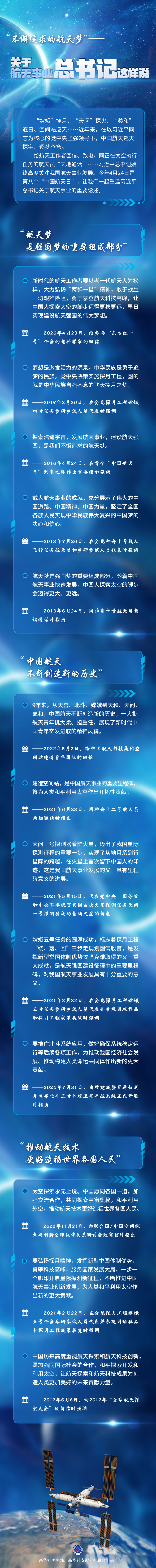 給航天工作者回信、致電,同正在太空?qǐng)?zhí)行任務(wù)的航天員“天地通話”……習(xí)近平總書記始終高度關(guān)注我國航天事業(yè)發(fā)展。今年4月24日是第八個(gè)“中國航天日”,讓我們一起重溫習(xí)近平總書記關(guān)于航天事業(yè)的重要論述。