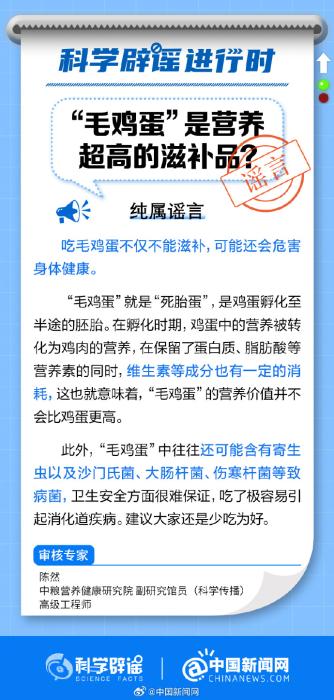 純屬謠言!“毛雞蛋”就是“死胎蛋”,是雞蛋孵化至半途的胚胎?!懊u蛋”的營養(yǎng)價值并不比雞蛋更高,其中還可能含有寄生蟲以及沙門氏菌、大腸桿菌、傷寒桿菌等致病菌,衛(wèi)生安全很難保證,吃了極容易引起消化道疾病。(來源:科學辟謠、中國新聞網微博)