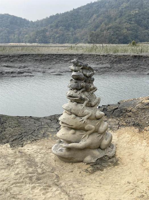 日月潭水位驟降,“九蛙疊像”全部上岸。圖片來源:臺灣中時新聞網(wǎng) 楊靜茹 攝