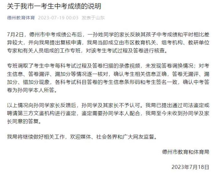 以上情況向?qū)O同學(xué)家長反饋后,孫同學(xué)及其家長不予認(rèn)可。德州市教育和體育局已提出通過司法鑒定或聘請第三方文鑒機構(gòu)進(jìn)行鑒定,鑒定需要孫同學(xué)本人配合,德州市教育和體育局至今未收到孫同學(xué)及家長同意的答復(fù)。