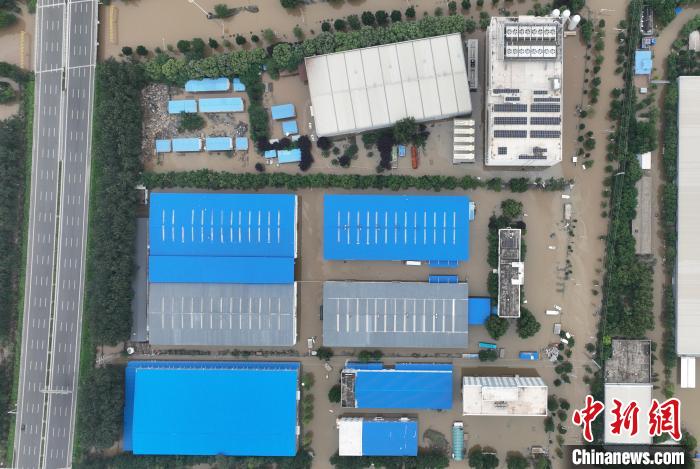 8月5日,中圖網(wǎng)倉(cāng)儲(chǔ)中心所在區(qū)域依然有大量積水。(無(wú)人機(jī)照片)中新社記者 韓冰 攝