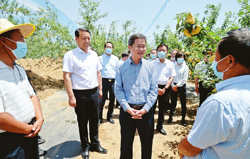 6月14日,省委副書記、省長(zhǎng)、省總河長(zhǎng)藍(lán)佛安來(lái)到吉縣柏山寺鄉(xiāng)“雙千畝”蘋果高新示范基地,與專業(yè)果樹種植戶親切交談,詳細(xì)了解基地建設(shè)及生產(chǎn)營(yíng)銷開發(fā)等情況。 本報(bào)記者李兆民攝