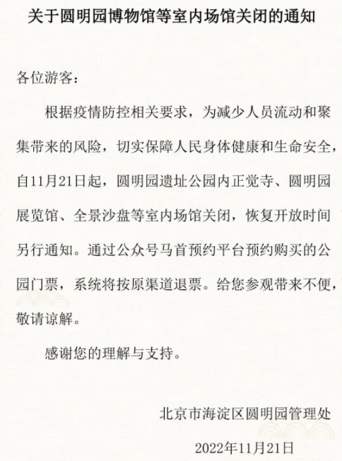 近日,北京市海淀區(qū)圓明園管理處發(fā)布關(guān)閉室內(nèi)場館的通知,自11月21日起,圓明園遺址公園內(nèi)正覺寺、圓明園展覽館、全景沙盤等室內(nèi)場館關(guān)閉,恢復開放時間另行通知。