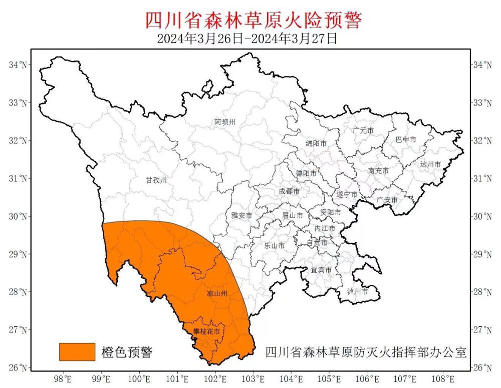 經四川省森防指辦公室與四川省林草局、四川氣象局及相關地區(qū)會商,預計3月26日至27日攀枝花市,甘孜州東部局地和南部,涼山州西部、中部和南部(涉及21個縣級行政單位)森林草原火險等級將維持在高度危險級別。經研究,延長省森防指辦公室3月21日發(fā)布的高森林草原火險橙色預警至3月27日,預警范圍不變。