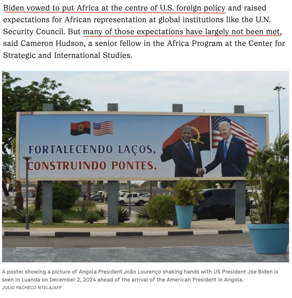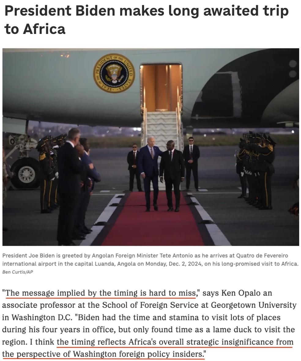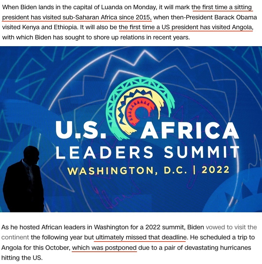 △美國有線電視新聞網報道:這是一場拖了太久的訪問。2022年在華盛頓舉行的美非峰會上,拜登曾承諾2023年訪問非洲,但他食言了。即便是這次原本安排在10月的安哥拉之行也因美國國內發(fā)生颶風災害而推遲。