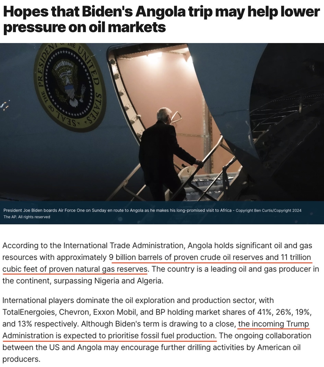 雖然拜登的任期即將結束,但預計即將上任的特朗普政府將優(yōu)先考慮化石燃料生產。美國和安哥拉之間正在進行的合作可能會鼓勵美國石油生產商進一步開展鉆探活動。