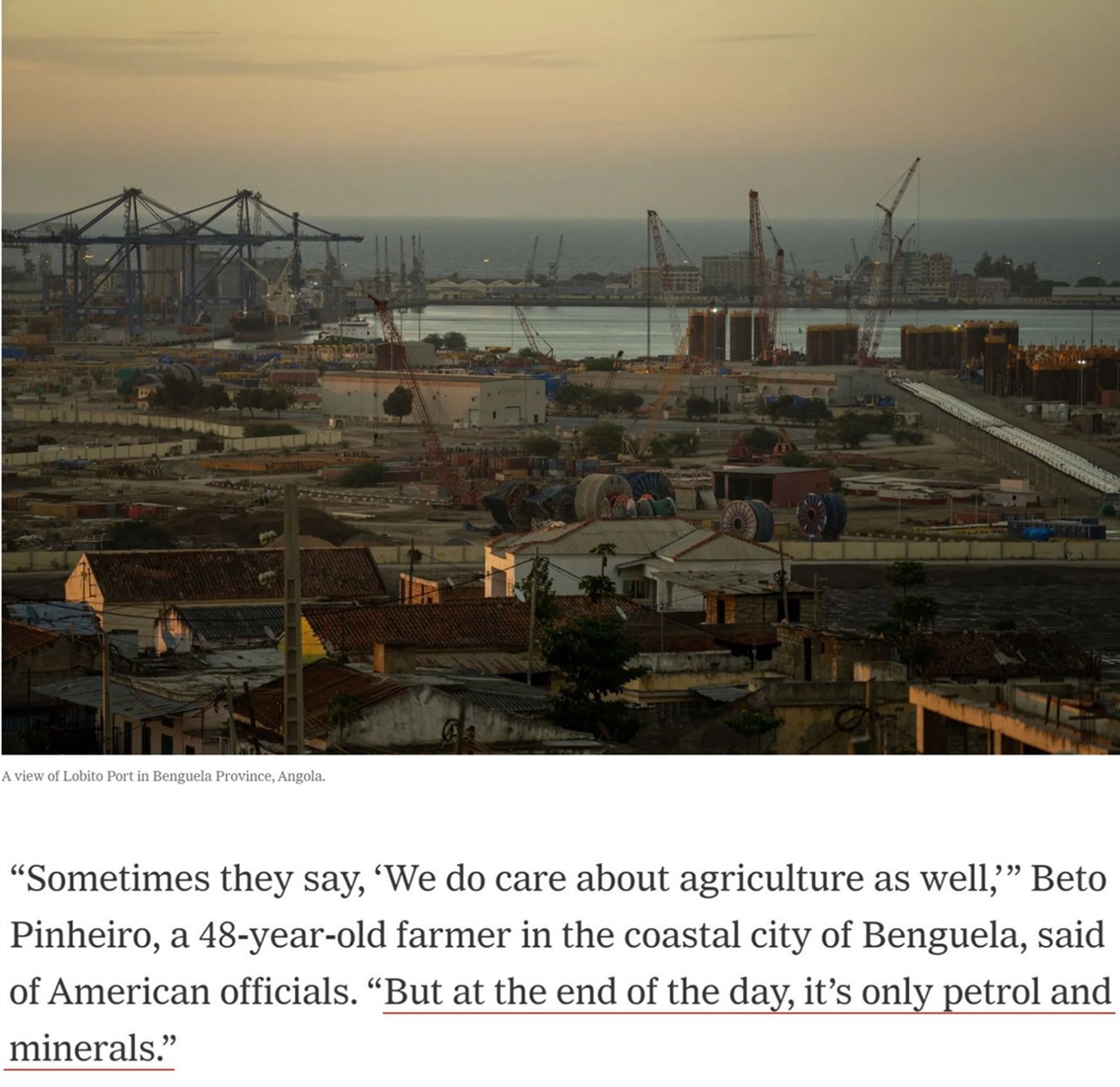 家住安哥拉沿海城市本格拉的48歲農民貝托·皮涅羅說:“有時他們(美國官員)會說,‘我們也關心(安哥拉的)農業(yè)’……但歸根結底,(美國關心的)只有石油和礦產。”