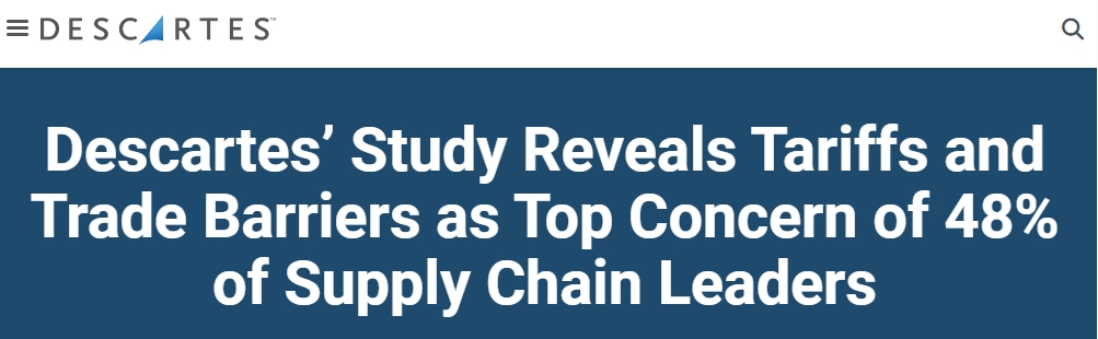 調(diào)查顯示,48%的受訪者認為關(guān)稅和貿(mào)易壁壘上升是他們最擔心的問題,緊隨其后的是供應(yīng)鏈中斷(45%)和地緣政治不穩(wěn)定(41%)。此外,無論所在公司規(guī)模大小,受訪者都將關(guān)稅和貿(mào)易壁壘列為當前面臨的首要問題。這項報告共調(diào)查了978名來自歐洲、北美、南美和亞太地區(qū)主要貿(mào)易國的供應(yīng)鏈領(lǐng)域領(lǐng)導(dǎo)者。