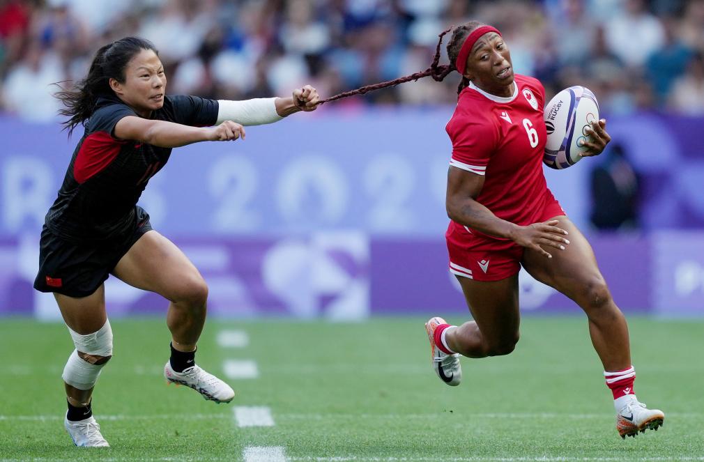7月29日,中國隊(duì)球員劉瀟倩(左)與加拿大隊(duì)球員夏麗蒂·威廉姆斯在比賽中。當(dāng)日,在巴黎奧運(yùn)會七人制橄欖球女子分組循環(huán)賽A組比賽中,中國隊(duì)17比26不敵加拿大隊(duì)。 新華社記者 呂小煒 攝
