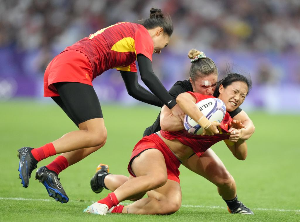 7月29日,中國隊(duì)球員胡宇(前)在比賽中。 當(dāng)日,在巴黎奧運(yùn)會七人制橄欖球女子四分之一決賽中,中國隊(duì)5比55不敵新西蘭隊(duì)。 新華社記者 呂小煒 攝