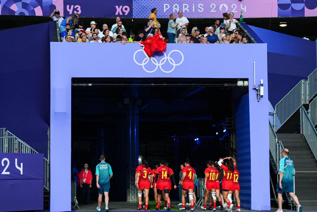 7月29日,中國隊(duì)選手劉瀟倩(右三)在賽后退場時向觀眾“比心”。當(dāng)日,在巴黎奧運(yùn)會七人制橄欖球女子四分之一決賽中,中國隊(duì)5比55不敵新西蘭隊(duì)。 新華社記者 許暢 攝