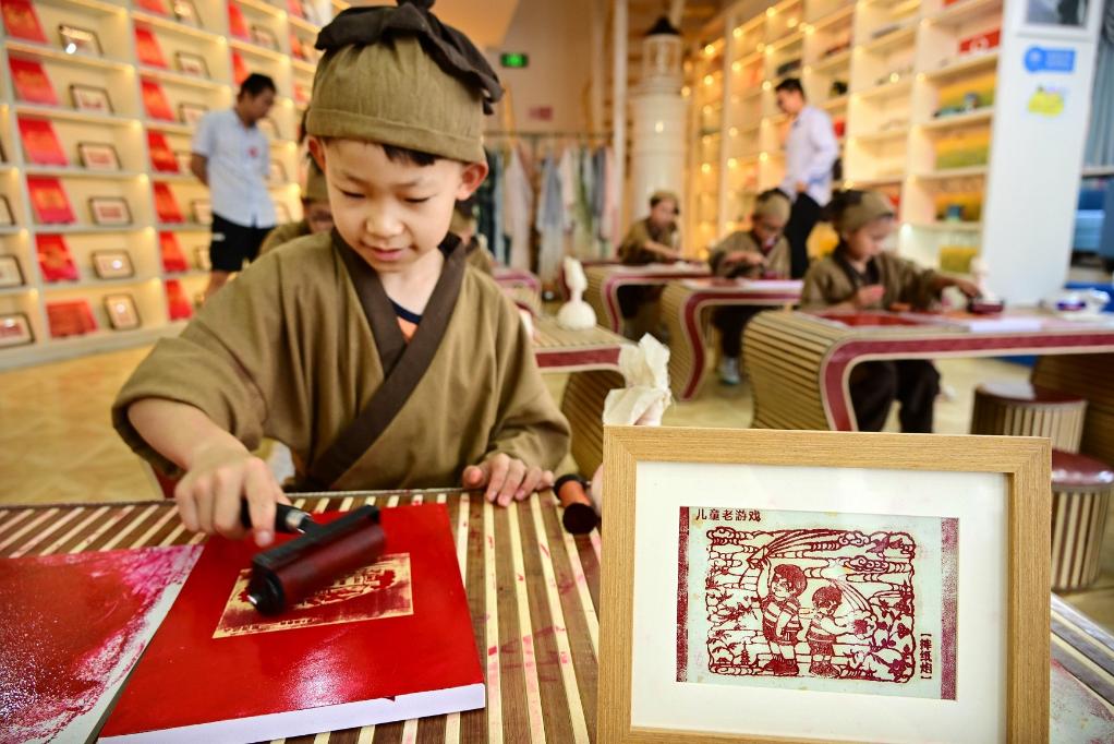 暑假期間,位于青島棧橋書店的印象國風(fēng)藝術(shù)館舉行拓印研學(xué)活動,吸引學(xué)生前來學(xué)習(xí)、體驗(yàn)。新華社記者 李紫恒 攝