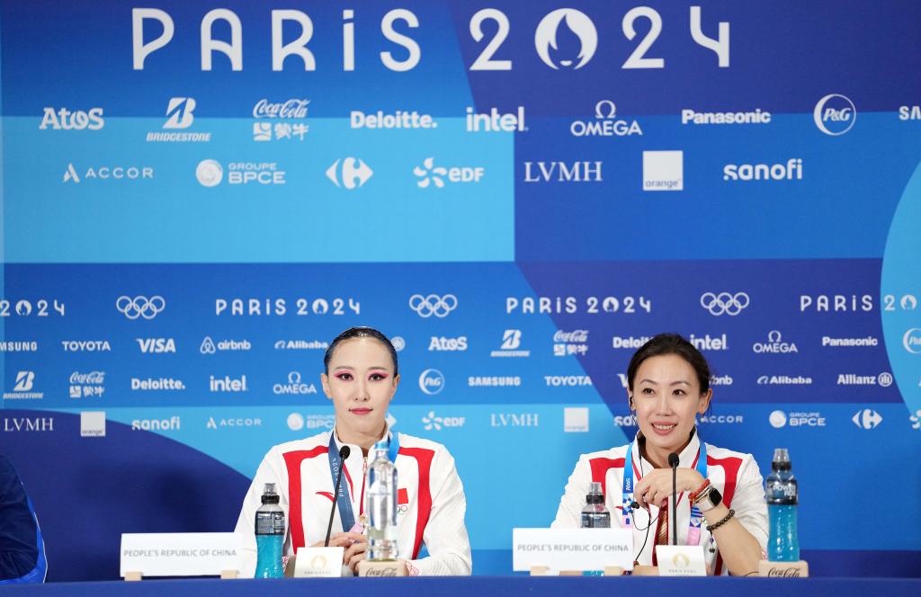8月7日,中國(guó)隊(duì)選手馮雨(左)和中國(guó)隊(duì)教練張曉歡出席賽后新聞發(fā)布會(huì)。新華社記者 薛宇舸 攝