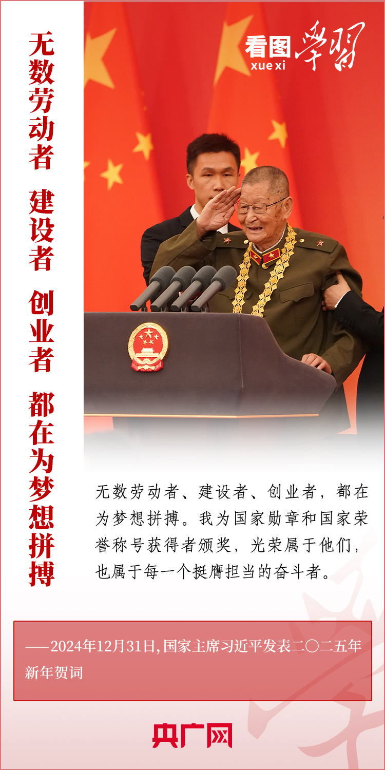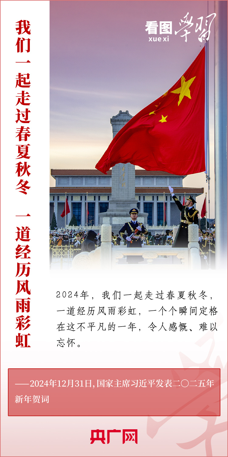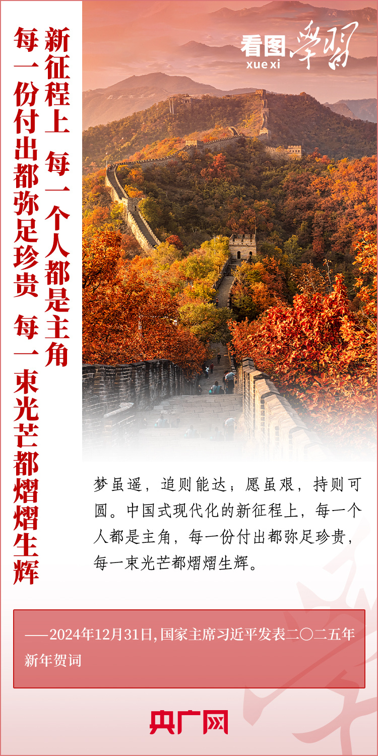 “夢雖遙,追則能達;愿雖艱,持則可圓?!毙履昵跋Γ暯街飨l(fā)表二〇二五年新年賀詞。在溫暖有力的講述中,習主席深情回望過去一年中國不平凡的奮斗歷程、精彩瞬間,感慨大家一道經(jīng)歷的風雨彩虹、難忘時刻,贊美無數(shù)為夢想拼搏的勞動者、建設者、創(chuàng)業(yè)者。習主席說,中國式現(xiàn)代化的新征程上,每一個人都是主角,每一份付出都彌足珍貴,每一束光芒都熠熠生輝。讓我們充滿信心,在新的一年接續(xù)奮斗!