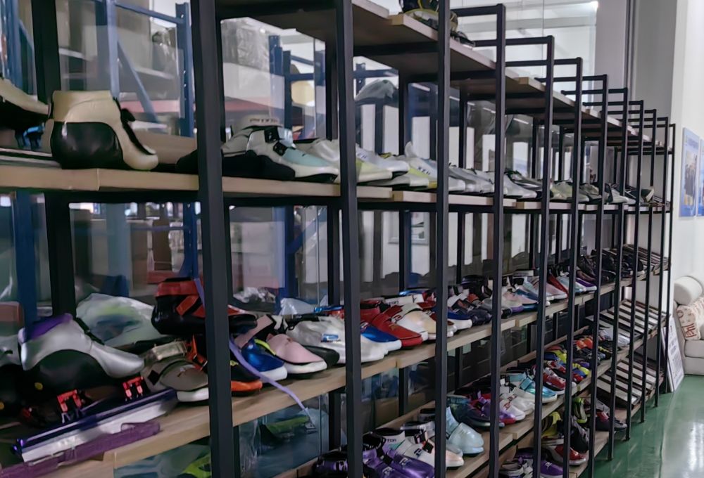 2025年1月2日,長(zhǎng)春百凝盾體育用品器材有限公司工廠里擺放的冰鞋樣品。新華社記者王帆 攝