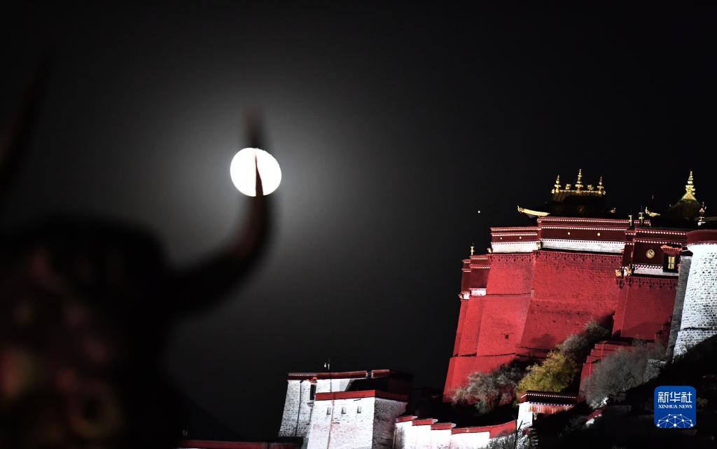 11月11日晚,一次賞心悅目的火星合月亮相天宇。這是在西藏拉薩市布達拉宮附近,記錄下的這幕“星月童話”。新華社記者 劉潁 攝