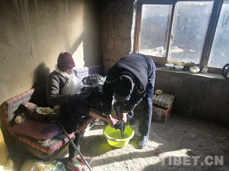 圖為達瓦次仁為熱薩鄉(xiāng)卡西村空巢老人洗腳