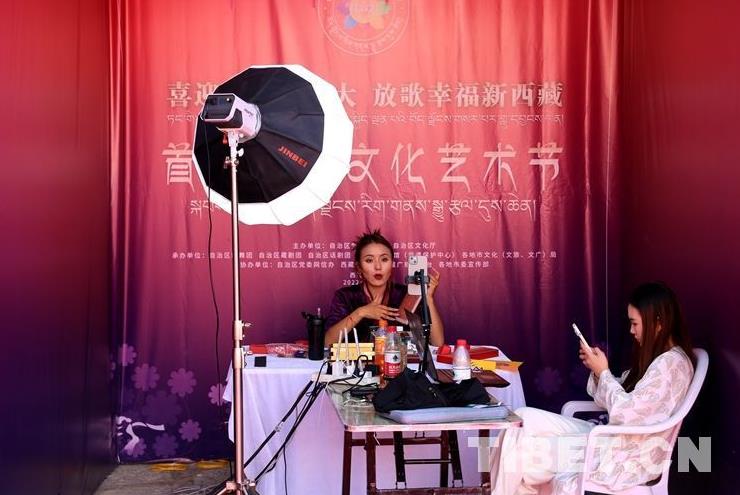 圖為在首屆西藏文化藝術(shù)節(jié)主場地——拉薩市金城公主劇場附近工作人員正在進行直播帶貨 攝影:王佳豪