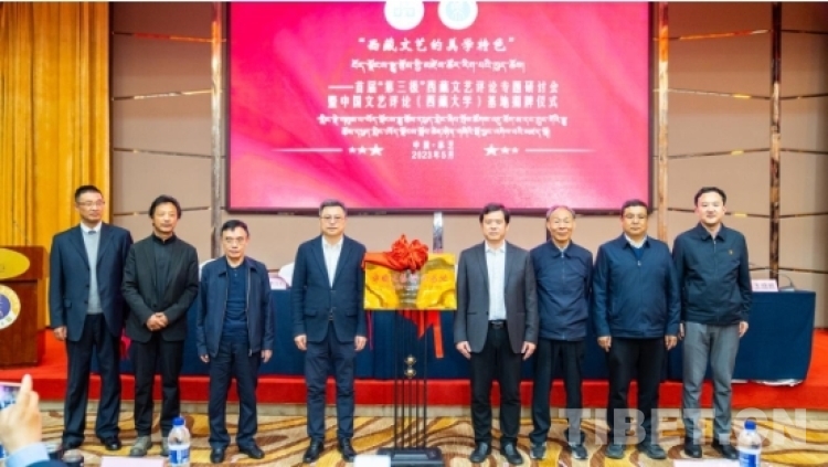 圖為出席領(lǐng)導(dǎo)共同為中國(guó)文藝評(píng)論(西藏大學(xué))基地揭牌