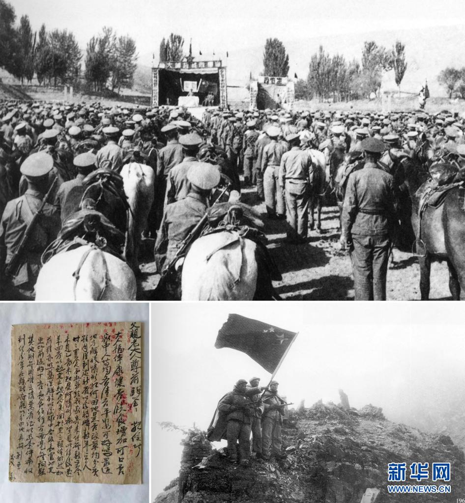 這是一張拼版照片,上圖為:1950年8月1日,獨(dú)立騎兵師一團(tuán)在新疆于田縣普魯村召開(kāi)進(jìn)藏誓師大會(huì)(資料照片,進(jìn)藏英雄先遣連紀(jì)念館供圖);左下圖為:先遣連烈士陳忠義的家書(受訪者供圖);右下圖為:1951年,阿里和平解放(資料照片,進(jìn)藏英雄先遣連紀(jì)念館供圖)。新華社發(fā)