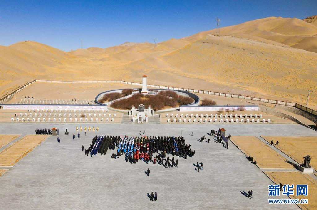 清明時(shí)節(jié),西藏阿里的黨員干部、解放軍、學(xué)生及群眾,聚集獅泉河烈士陵園,祭奠英靈(2021年4月4日攝,無(wú)人機(jī)照片)。新華社記者 張兆基 攝
