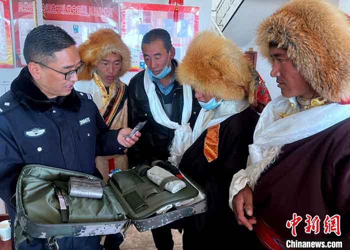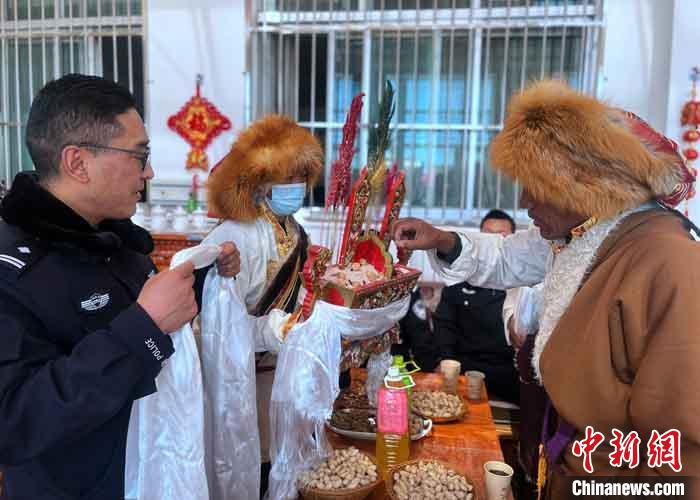 圖為民警向民眾敬獻(xiàn)哈達(dá) 。柳志軍 攝