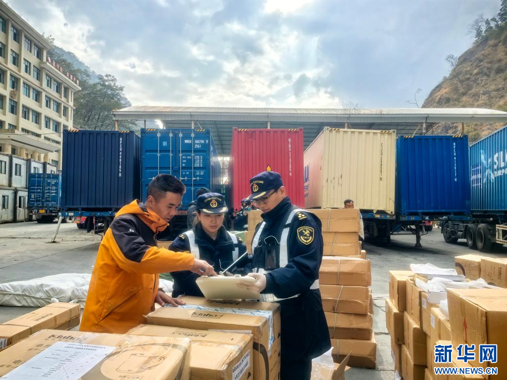 拉薩海關所屬聶拉木海關工作人員監(jiān)管進出口貨物。(拉薩海關供圖)