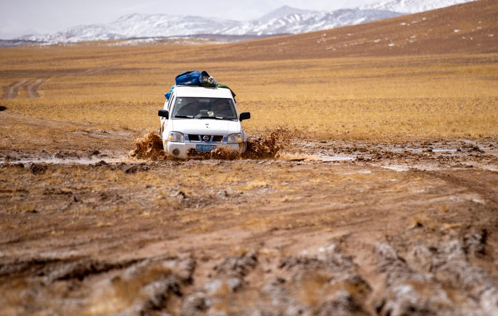 離開(kāi)尼瑪縣城,巡山隊(duì)伍沿土路行進(jìn)。很快,土路沒(méi)有了,車隊(duì)只能沿著之前巡山時(shí)留下的車轍走。找不到車轍的時(shí)候,山就是路標(biāo)。