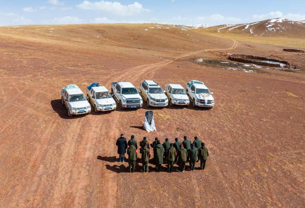 野生動(dòng)物專業(yè)管護(hù)隊(duì)員在羅布玉杰烈士紀(jì)念碑前默哀致敬(無(wú)人機(jī)照片,5月10日攝)。新華社記者 姜帆 攝