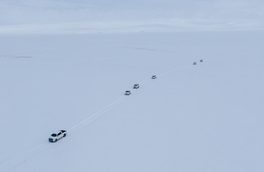 野生動(dòng)物專業(yè)管護(hù)隊(duì)員的車隊(duì)在大雪中巡護(hù)(無(wú)人機(jī)照片,5月8日攝)。新華社記者 丁增尼達(dá) 攝
