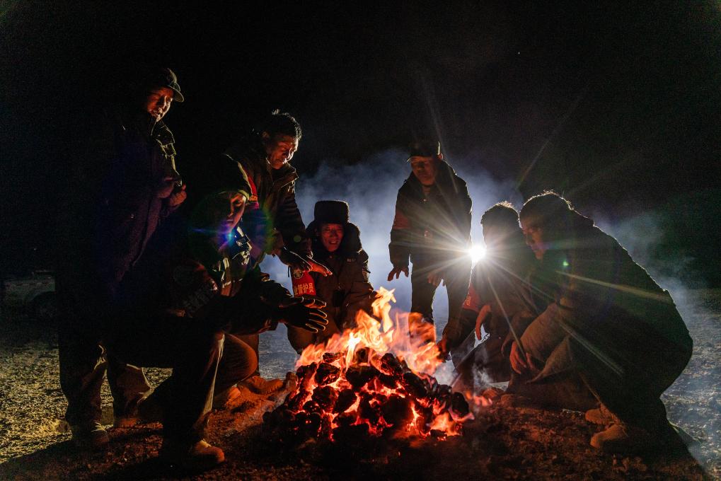 野生動(dòng)物專業(yè)管護(hù)隊(duì)員在宿營(yíng)地的寒夜里烤火,燃料是野牦牛的糞便(5月10日攝)。新華社記者 丁增尼達(dá) 攝