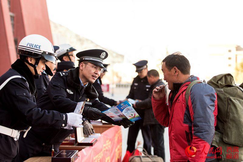 春運首日,拉薩鐵路公安處干警為旅客群眾做好事達800余件,為旅客解答問題3000余次,發(fā)放春運各類宣傳資料3000余份,全力打造“平安、有序、溫馨”的春運環(huán)境。圖為拉薩鐵路公安處民警為旅客講解禁毒常識。圖片來源:人民網(wǎng)