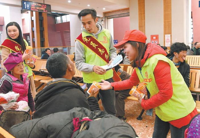 拉薩火車站團委聯(lián)合中國移動西藏公司開展“黨團志愿者愛心送溫暖 服務(wù)春運返鄉(xiāng)農(nóng)民工”主題活動,一個個黨團員志愿者的身影在候車室里忙碌著。圖為2月1日,中國移動西藏公司的志愿者正在拉薩火車站候車室給旅客發(fā)放奶茶、礦泉水。 圖片來源:西藏日報 李洲 攝