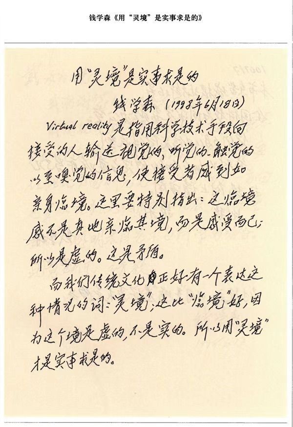 1998年6月18日,87歲的錢學森寫了一篇短文《用“靈境”是實事求是的》,其中寫道:“我們傳統(tǒng)文化正好有一個表達這種情況的詞‘靈境’;這比‘臨境’好,因為這個境是虛的,不是實的?!?/p>