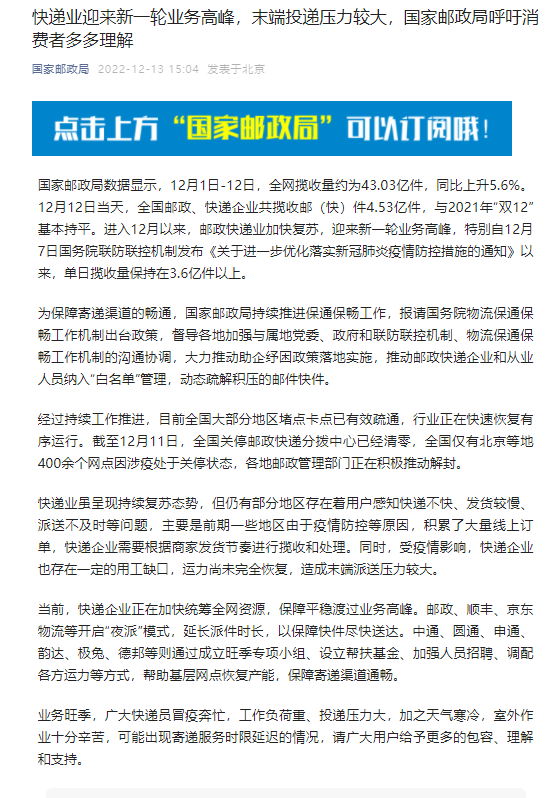 據(jù)“國家郵政局”公眾號13日消息,當(dāng)前,快遞企業(yè)正在加快統(tǒng)籌全網(wǎng)資源,保障平穩(wěn)渡過業(yè)務(wù)高峰。郵政、順豐、京東物流等開啟“夜派”模式,延長派件時長,以保障快件盡快送達(dá)。中通、圓通、申通、韻達(dá)、極兔、德邦等則通過成立旺季專項小組、設(shè)立幫扶基金、加強人員招聘、調(diào)配各方運力等方式,幫助基層網(wǎng)點恢復(fù)產(chǎn)能,保障寄遞渠道通暢。(中新財經(jīng))