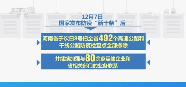 據(jù)了解,12月7日,國家發(fā)布防疫“新十條”后,河南省于次日把全省492個高速公路和干線公路防疫檢查點全部撤除,并繼續(xù)加強與80余家運輸企業(yè)和省相關(guān)部門的業(yè)務(wù)聯(lián)系,充分發(fā)揮“12328服務(wù)監(jiān)督熱線+三級調(diào)度”機(jī)制作用,每日收集運輸受阻問題,以便及時解決問題。