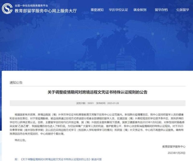 中國青年報客戶端北京1月29日電(中青報·中青網(wǎng)記者 葉雨婷)記者從教育部留學(xué)服務(wù)中心(以下簡稱“中心”)官方網(wǎng)站獲悉,1月28日,中心發(fā)布《關(guān)于調(diào)整疫情期間對跨境遠(yuǎn)程文憑證書特殊認(rèn)證規(guī)則的公告》指出,對于2023年春季學(xué)期(南半球秋季學(xué)期)及以后仍采用遠(yuǎn)程方式學(xué)習(xí)(包括新入學(xué)和繼續(xù)學(xué)習(xí)的情況)所獲國(境)外文憑證書,中心將不再提供認(rèn)證服務(wù)。