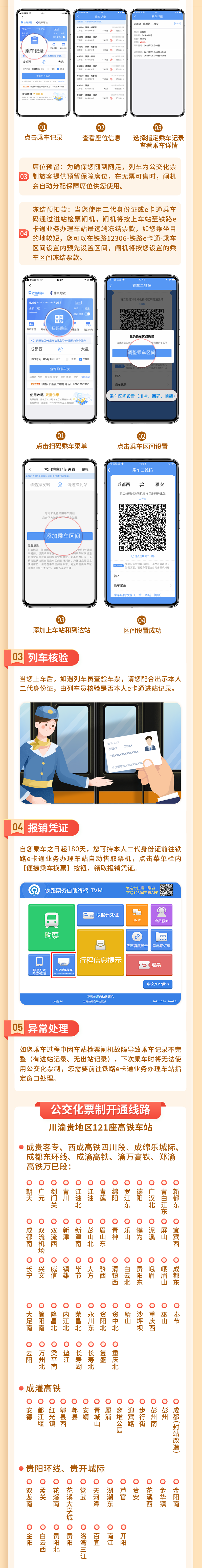 為進(jìn)一步提升通勤旅客出行體驗(yàn),中國(guó)鐵路成都局集團(tuán)有限公司管內(nèi)的川渝貴地區(qū)121座高鐵車站啟用公交化票制。已開通鐵路e卡通的旅客在鐵路12306客戶端-鐵路e卡通主頁(yè),啟用刷證模式,即可使用二代身份證或e卡通乘車碼,實(shí)現(xiàn)無需購(gòu)票,刷證或掃碼即走。