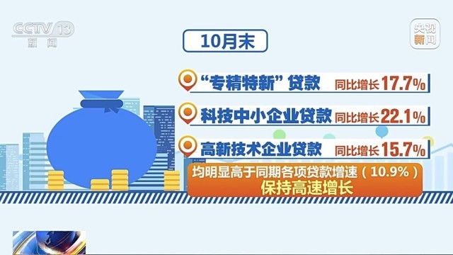 數(shù)據(jù)顯示,目前我國科技創(chuàng)新、制造業(yè)、綠色發(fā)展、普惠小微等重點(diǎn)領(lǐng)域貸款增量和占比都在明顯上升。10月末,“專精特新”、科技中小企業(yè)、高新技術(shù)企業(yè)貸款分別同比增長17.7%、22.1%、15.7%,均明顯高于同期各項(xiàng)貸款增速,保持高速增長。