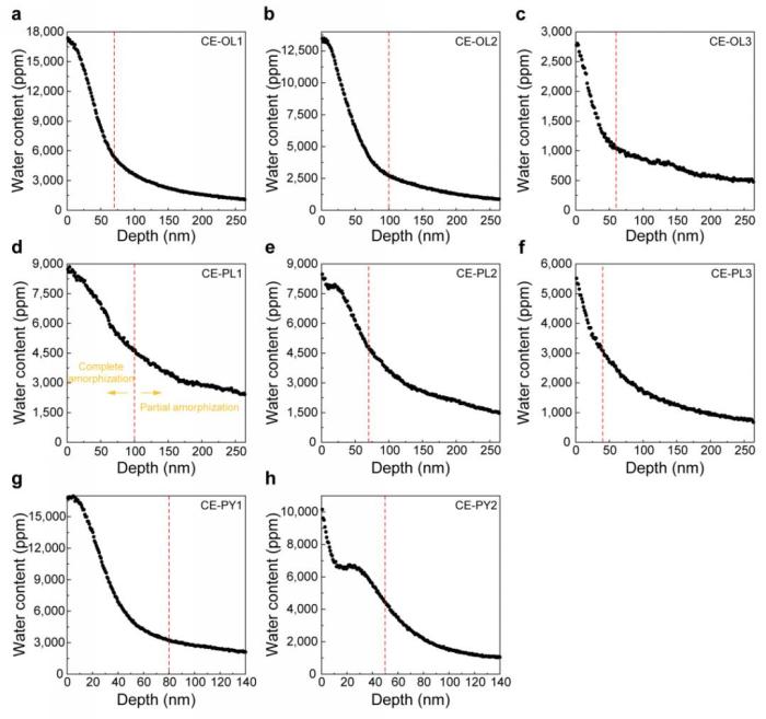 月表的翻騰作用導(dǎo)致月壤顆粒暴露在太陽風(fēng)中的時間不同,即礦物中注入的太陽風(fēng)質(zhì)子總量不同,從而導(dǎo)致太陽風(fēng)成因水的含量不同。太陽風(fēng)粒子注入會造成礦物表面結(jié)構(gòu)破壞,因此環(huán)帶的非晶化程度可以評估礦物的暴露時間。此次研究發(fā)現(xiàn)礦物的太陽風(fēng)暴露時間是影響太陽風(fēng)成因水含量最主要的因素。