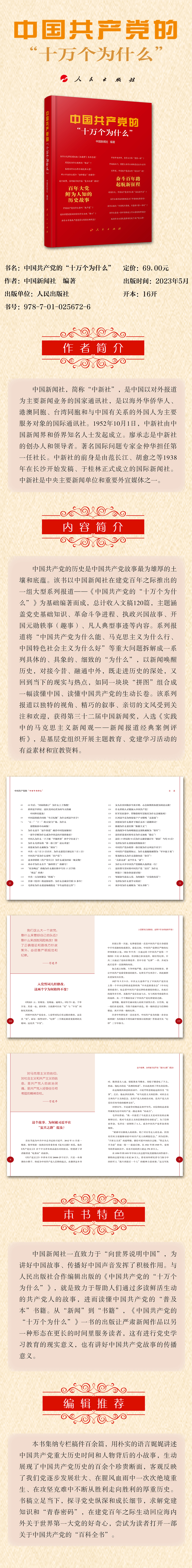 中國(guó)新聞社一直致力于“向世界說(shuō)明中國(guó)”,為講好中國(guó)故事、傳播好中國(guó)聲音發(fā)揮了積極作用。與人民出版社合作編輯出版的《中國(guó)共產(chǎn)黨的“十萬(wàn)個(gè)為什么”》,就是致力于幫助人們通過(guò)多讀鮮活生動(dòng)的共產(chǎn)黨人的故事,進(jìn)而讀懂中國(guó)共產(chǎn)黨的“普及本”書(shū)籍。從“新聞”到“書(shū)籍”,《中國(guó)共產(chǎn)黨的“十萬(wàn)個(gè)為什么”》一書(shū)的出版讓嚴(yán)肅新聞作品以另一種形態(tài)在更長(zhǎng)的時(shí)間里服務(wù)讀者,這有進(jìn)行黨史學(xué)習(xí)教育的現(xiàn)實(shí)意義,也有講好中國(guó)共產(chǎn)黨故事的傳播意義。