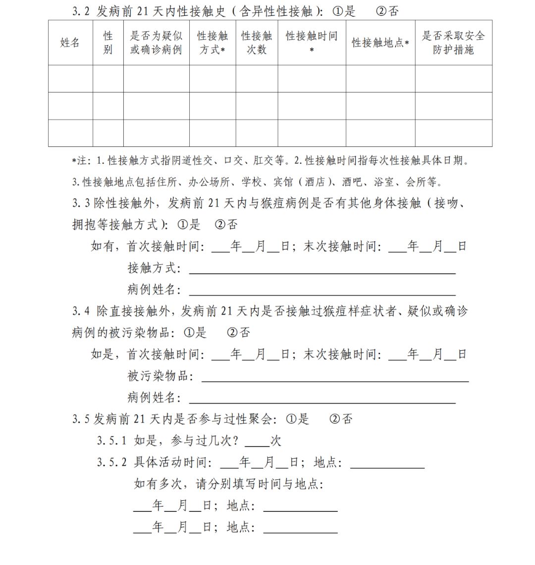 調(diào)查內(nèi)容主要包括病例基本信息、發(fā)病就診情況、臨床表現(xiàn)、轉(zhuǎn)歸及實(shí)驗(yàn)室檢測;發(fā)病前21天內(nèi)與可疑感染來源的接觸史、接觸場所及接觸方式;發(fā)病后至隔離治療前的具體活動(dòng)地點(diǎn)、與其有皮膚或黏膜直接接觸者,以及發(fā)病前4天內(nèi)與其有性接觸者。