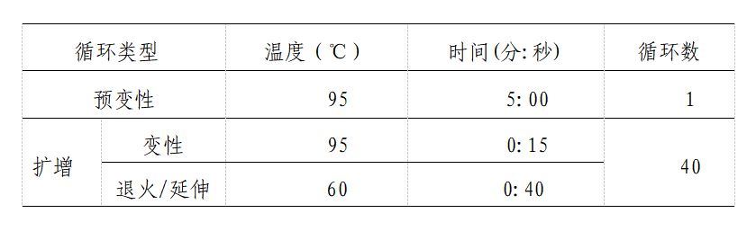 ?、軆x器檢測通道選擇:使用熒光定量PCR檢測儀,選擇Fam熒光信號(hào)檢測通道,收集設(shè)在60℃。具體設(shè)置方法參照各儀器使用說明書。